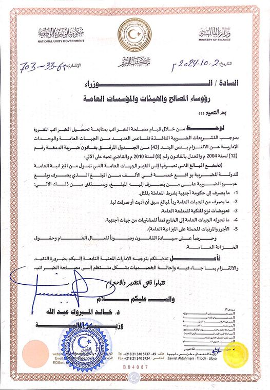 جاء ذلك في خطاب موجه من وزير المالية، خالد المبروك، إلى الوزراء ورؤساء المصالح والهيئات والمؤسسات العامة، يطالبهم فيه “بتوجيه الإدارات المعنية التابعة إليهم بضرورة التقيد والالتزام بقانون ضريبة الدمغة، وإحالة الضرائب بشكل منتظم إلى المصلحة”، بحسب منشور عبر صفحة الوزارة على «فيسبوك».
