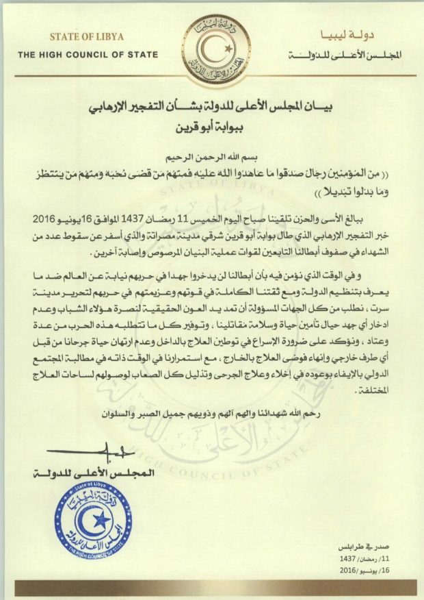 ينعى المجلس الأعلى للدولة شهداء التفجير الإرهابي الذي طال بوابة أبوقرين شرقي مدينة مصراتة صباح اليوم الخميس.