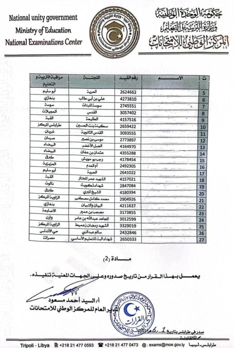 وتضمن القرار قائمة بأسماء التلاميذ المعنيين موزعين على عدد من المؤسسات التعليمية بمختلف المناطق، من بينها: طرابلس، بنغازي، مصراتة، القبة، نالوت، البيضاء، الزاوية، طبرق، العجيلات، وغيرها.