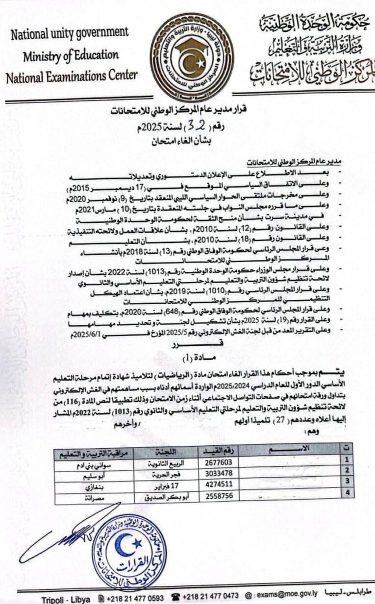 أصدر مدير عام المركز الوطني للامتحانات أحمد مسعود القرار رقم (32) لسنة 2025م، بشأن إلغاء امتحان مادة الرياضيات لعدد 27 تلميذًا من تلاميذ شهادة إتمام مرحلة التعليم الأساسي (الدور الأول) للعام الدراسي 2024-2025، وذلك على خلفية ثبوت مساهمتهم في الغش الإلكتروني عبر تداول ورقة الامتحان خلال زمن الاختبار على منصات التواصل الاجتماعي.
