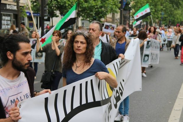 انضمت الممثلة إلى صفوف المتظاهرين في دمشق منذ بدء الأزمة السورية، واعتقلت من قبل القوات الأمنية عدة مرات، إلى أن غادرت خارج سوريا متوجهة إلى الأردن، وفيما بعد إلى العاصمة الفرنسية باريس.