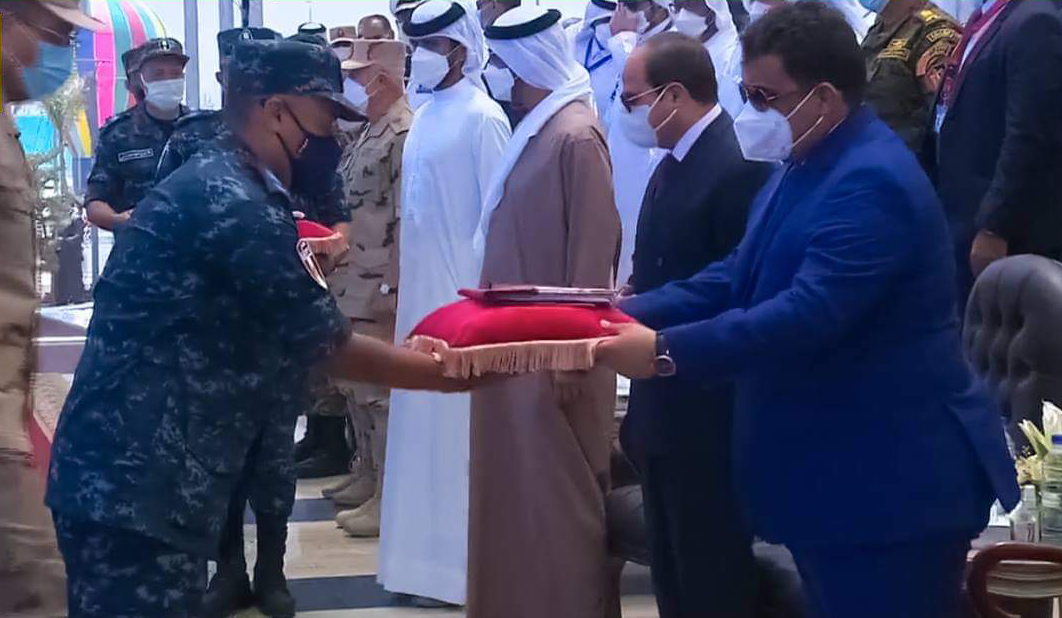 كما شارك المنفي»الرئيس السيسي في تسليم أعلام الوحدات البحرية المنضمة حديثا للقاعدة البحرية الجديدة لقائد القاعدة البحرية 3 يوليو وقادة الوحدات بالقاعدة، وذلك إيذانا ببدء دخولها الخدمة.