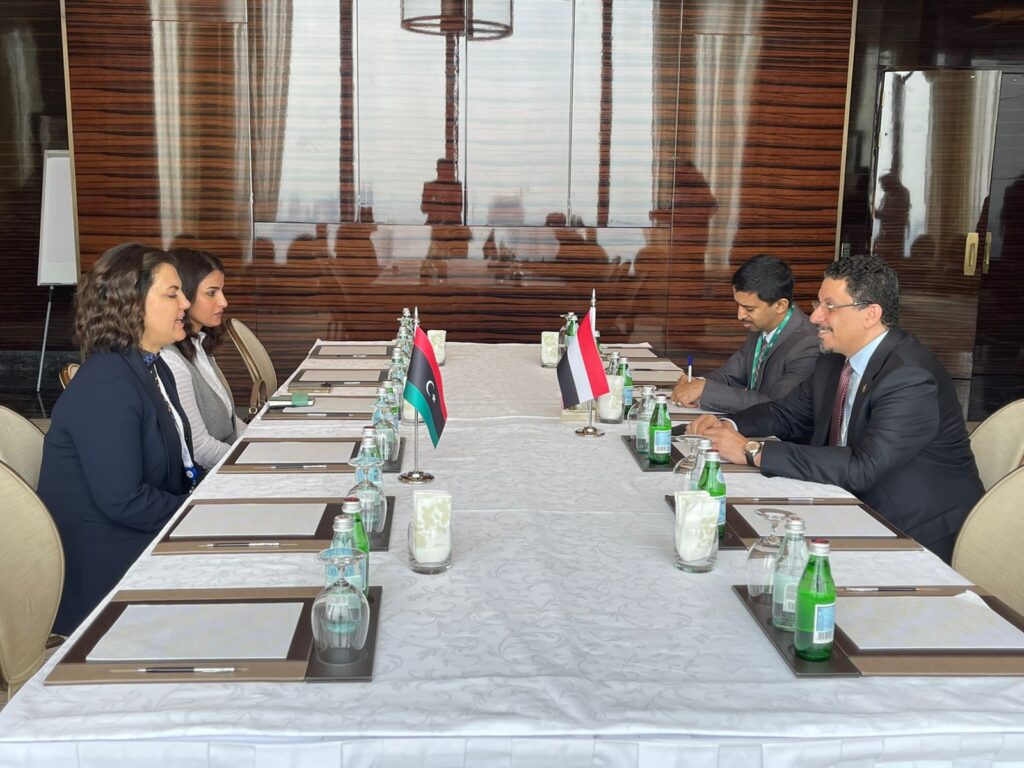 وبحسب ما أفادت الخارجية اليمنية في بيان، فقد بحث اللقاء العلاقات الثنائية بين البلدين الشقيقين وسبل تعزيزها ومستجدات الاوضاع السياسية في المنطقة خاصة على الساحتين اليمنية والليبية والقضايا ذات الاهتمام المشترك.
