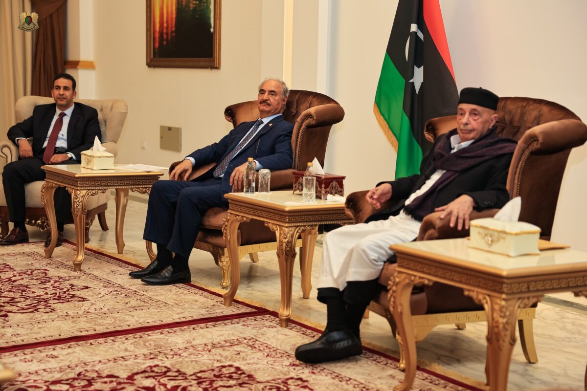 وبعد تعليق جلسة مناقشة نتائج لجنة 6+ 6 المعنية بمراجعة قوانين الانتخابات اجتمع خليفة حفتر الثلاثاء بمقر إقامته بالرجمة برئيس مجلس النواب عقيلة صالح ونائبيه الأول والثاني وذلك بحضور 90 نائبا عن المجلس.