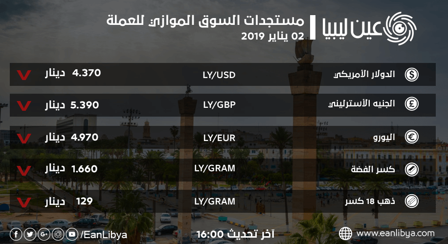 هذا وسجل سعر اليورو الأوروبي مقابل الدينار الليبي انخفاضاً طفيفاً مع بدء تعاملات السوق الموازي وبلغ سعره اليوم «4,970» دينار ليبي مقارنة بـ «5.000» عند الإغلاق بالأمس، حيث تعرضت العملة الأوروبية في منتصف شهر يناير من هذه السنة إلى هبوط قاسي لم تشهده منذ أكثر من عام.