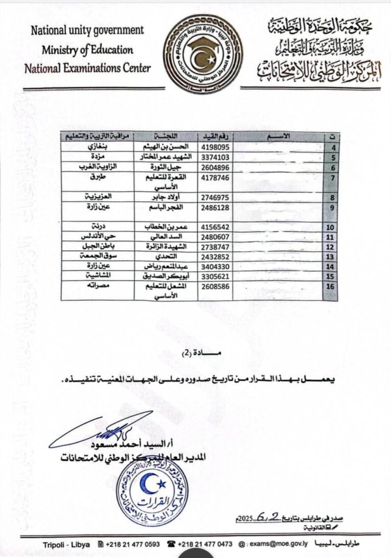 وشمل القرار أسماء التلاميذ المعنيين وأرقام قيدهم واللجان الامتحانية التابعين لها، موزعين على عدد من المناطق التعليمية، منها: طرابلس، الزاوية، مصراتة، بنغازي، طبرق، مزدة، العزيزية، درنة، سوق الجمعة، وحي الأندلس.