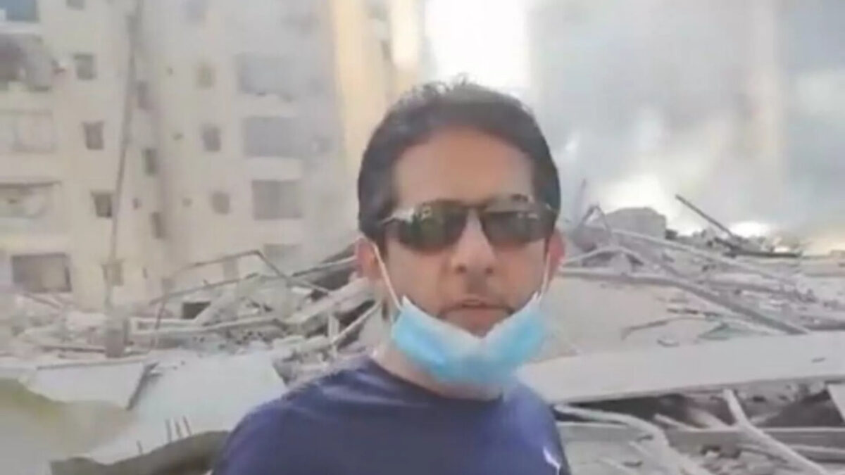ظهر الفنان اللبناني معين شريف، وهو يتحدث بحزن من أمام منزله المدمّر بالضربات الإسرائيلية في الضاحية الجنوبية للعاصمة اللبنانية بيروت.