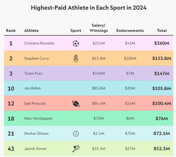وضمت قائمة الـ100 رياضي الأعلى أجرا لاعبين من 8 رياضات مختلفة، بما في ذلك كرة القدم، كرة السلة، التنس، الغولف، والملاكمة، وفقا لشركة الإعلام الرياضي الأمريكية Sportico.