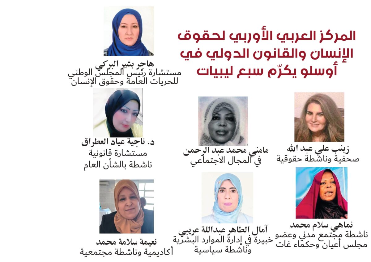 أما قائمة المكرمات من المركز العربي الأوروبي لحقوق الإنسان والقانون الدولي الذي يتخذ من أسلو مقرا له، فقد تضمنت 7 ليبيات متميزات في مختلف المجالات من مختلف مناطق ليبيا، وهن: