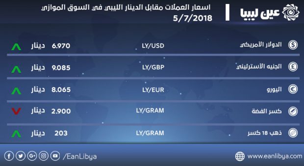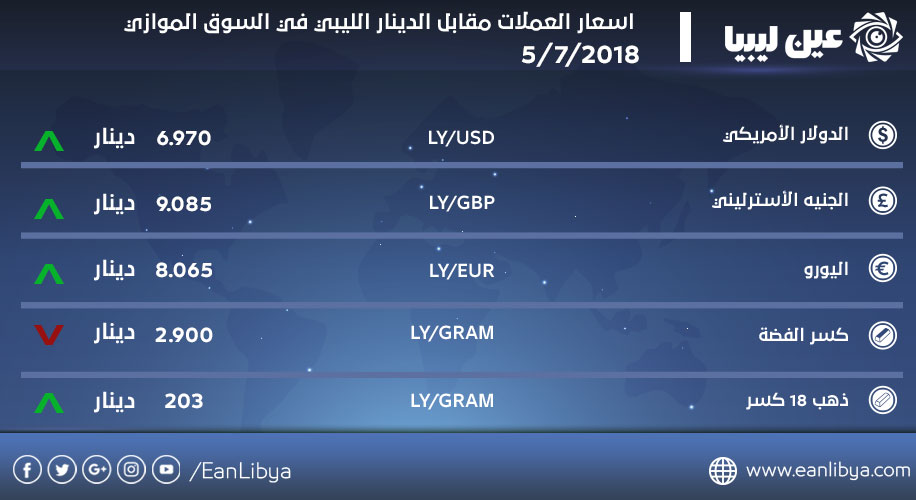 هذا وسجل سعر اليورو الأوروبي مقابل الدينار الليبي ارتفاعاً طفيفاً مع بدء تعاملات السوق الموازي وبلغ سعره اليوم «8,065» دينار ليبي مقارنة بـ «8.000» عند الإغلاق بالأمس، حيث تعرضت العملة الأوروبية في منتصف شهر يناير من هذه السنة إلى هبوط قاسي لم تشهده منذ أكثر من عام.