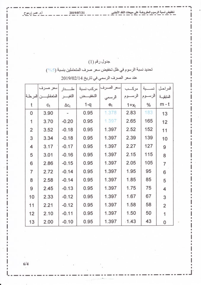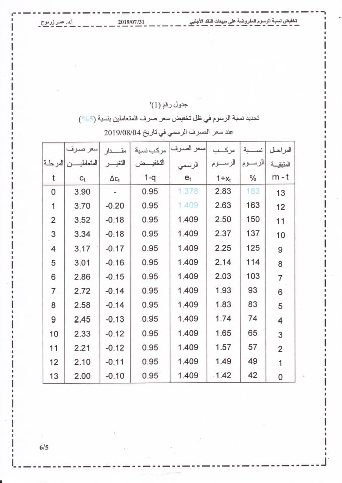 سعر الصرف الرسمي (سعر البيع) حسب مصرف ليبيا المركزي في تاريخ 2019/07/30 كان (e1=1.409) وبذلك يمكن تعديل الجدول رقم (1) ليصبح الجدول رقم (1)’ الذي يبين أثر هذا التغير الطفيف في سعر الصرف الرسمي على الرسوم المفروضة لتنخفض هذه الرسوم من 183% إلى 163% بدلاً من 165% في شهر فبراير الماضي صائعة فرقا في الرسوم قدره 20% بدلا من18%.