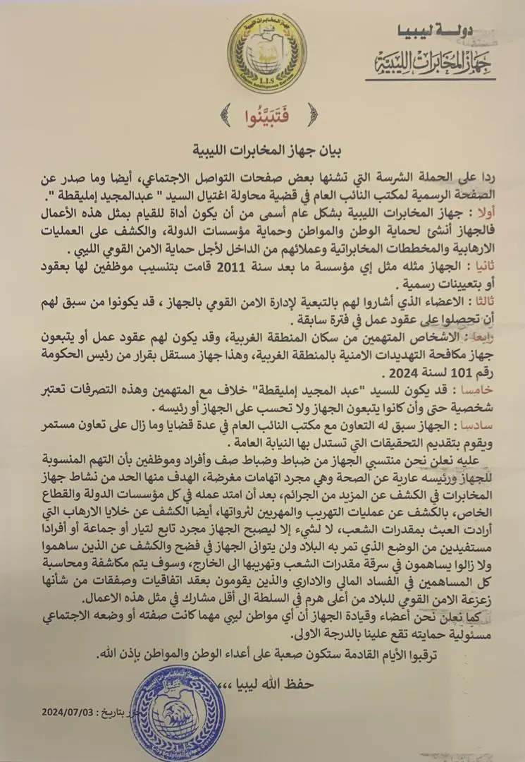 وأكد الجهاز أنه بشكل عام أسمى من أن يكون أداة للقيام بمثل هذه الأعمال فالجهاز أنشئ لحماية الوطن والمواطن وحماية مؤسسات الدولة، والكشف على العمليات الإرهابية والمخططات المخابراتية وعملائهم من الداخل لأجل حماية الأمن القومي الليبي.