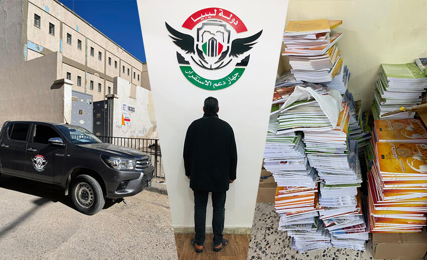 هذا وقام جهاز دعم الاستقرار أيضاً، بضبط رئيس الوحدة التخزينية طرابلس المركز بمصلحة المرافق التعليمية وهو في طريقه لبيع كتب مدرسية بأعداد كبيرة والتي قام بسرقتها من المخازن.