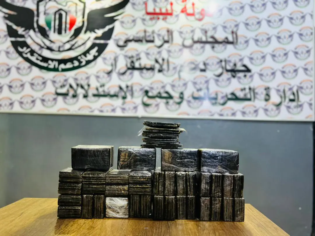 وبحسب ما أفاد في الجهاز في بلاغ، فقد تمكن أعضاء إدارة التحريات وجمع الاستدلالات بجهاز دعم الاستقرار، في عملية أمنية محكمة، من ضبط شخصين ليبيي الجنسية (م.ح.ع) و (ع.م.م) وبحوزتهما عشر قطع من خدر الحشيش بوزن كيلوغرام واحد.