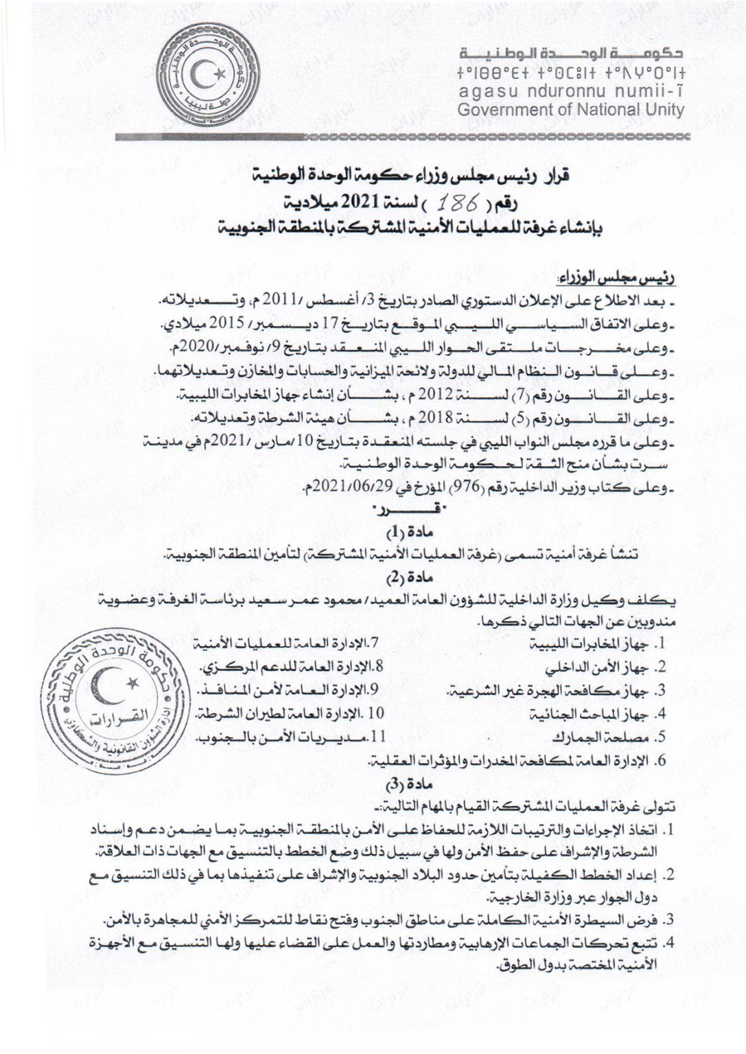 أصدر ئيس حكومة الوحدة الوطنية عبد الحميد الدبيبة، قرارا بإنشاء “غرفة العمليات الأمنية المشتركة” لتأمين المنطقة الجنوبية، يترأسها وكيل الداخلية العميد محمود عمر سعيد، وتتولى دعم الشرطة وإسنادها، والمجاهرة بالأمن وفرضه، وتتبُّع الجماعات الإرهابية والقضاء عليها، ومراقبة المجموعات المسلحة القادمة من دول الجوار وطردها.