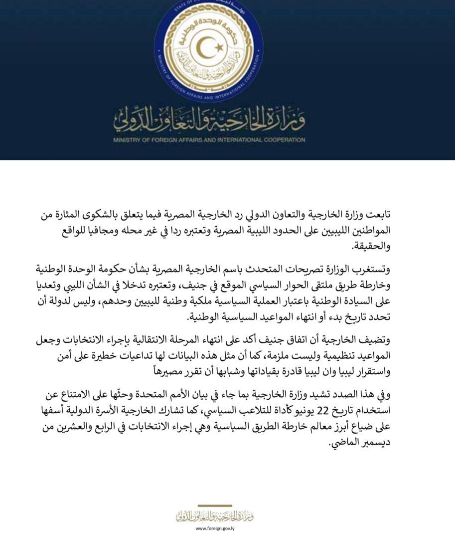 واشادت خارجية الوحدة ببيان الأمم المتحدة الداعي لعدم استخدام تاريخ 22 يونيو كأداة للتلاعب السياسي، مضيفة في الوقت نفسه، أنّ رد الخارجية المصرية فيما يتعلق بشكوى المواطنين الليبيين على الحدود المصرية مجاف للواقع والحقيقة وفي غير محله.