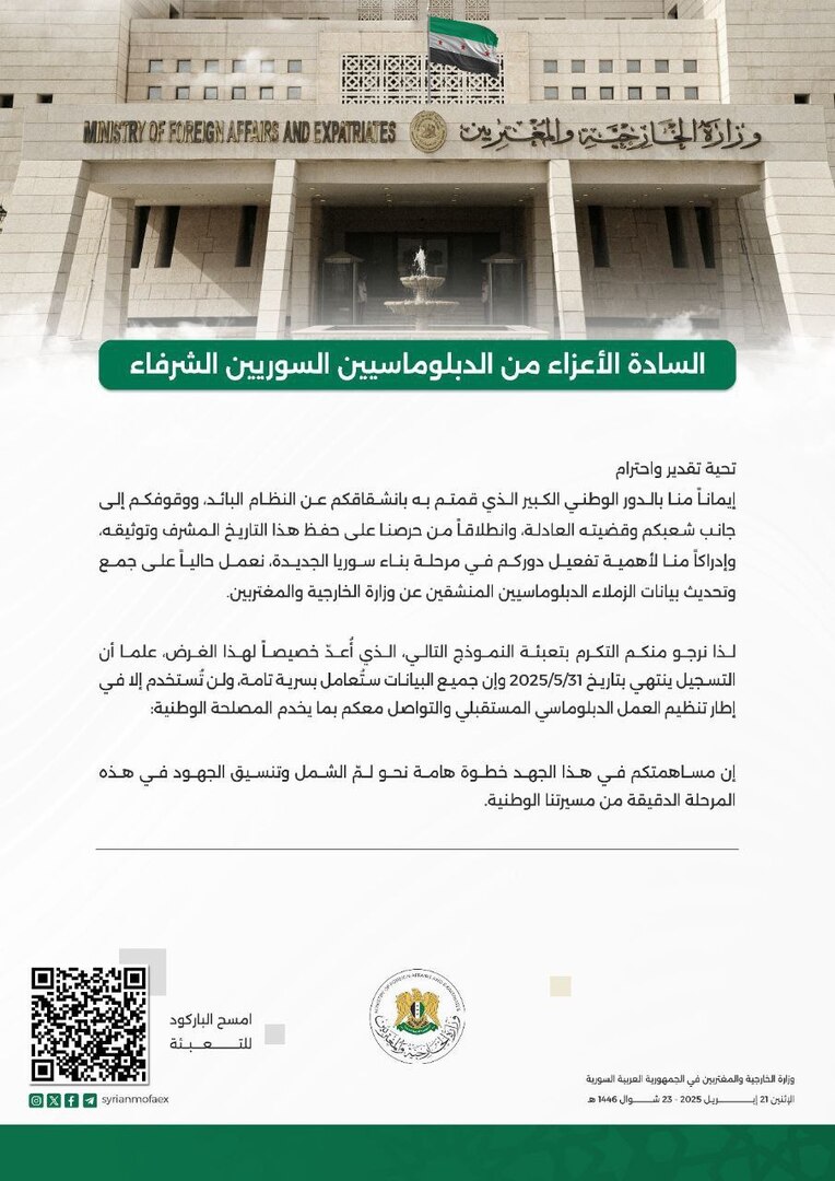 وتابع: “نرجو منكم التكرم بتعبئة النموذج التالي، الذي أُعد خصيصاً لهذا الغرض، علماً أن التسجيل ينتهي بتاريخ 2025/5/31، وأن جميع البيانات ستُعامل بسرية تامة، ولن تُستخدم إلا في إطار تنظيم العمل الدبلوماسي المستقبلي، والتواصل معكم بما يخدم المصلحة الوطنية”.