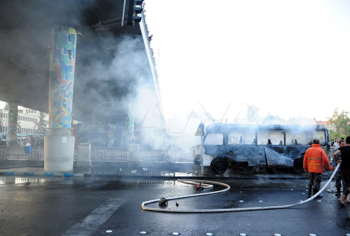 أفادت الوكالة السورية للأنباء”سانا، بوقوع تفجير وصفته بـ”الإرهابي” بعبوتين ناسفتين استهدف حافلة تابعة لجيش النظام السوري عند جسر الرئيس في العاصمة دمشق، أسفر عن 14 قتيلا وعدد من الجرحى>