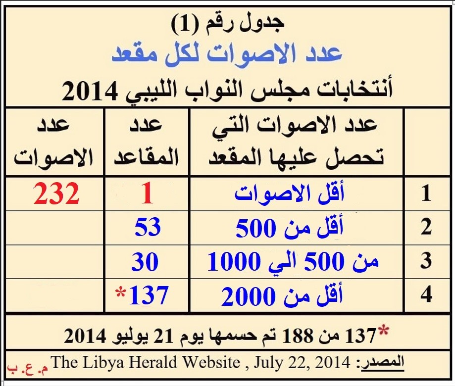 رابعا: اختيار مرشح واحدة فقط، في هذا النظام يقوم الناخب باختيار مرشح واحد فقط من مجموع المرشحين الذين سيقومون بتمثيله في المجلس التشريعي، بمعنى آخر، يقوم هذا النظام على أساس الاقتراع لصالح مرشح واحد فقط في دائرة متعددة التمثيل، فعلى سبيل المثال، لقد خُصص لدائرة مصراتة الفرعية في انتخابات عام 2014، ثمان (8) مقاعد في مجلس النواب (سبع مقاعد للرجال ومقعد للمرأة)، ولكن لم يسمح للناخب في هذه الدائرة إلا اختيار مرشح واحد فقط من بين المرشحين لمقاعد الرجال السبع، بالرغم من أن هؤلاء النواب السبع سينوبون عنه ويتحدثون باسمه في المجلس، وهذا يعني أن صوت هذا الناخب في الحقيقة يساوي واحد على سبعة (1/7) من صوت ناخب آخر في دائرة بها ممثل واحد (كما هو الحال، على سبيل المثال، في الدوائر الفرعية الانتخابية: الأصابعة وكاباو ومزدة وغدامس في الغرب، وأم الأرانب وتراقن ووادي عتبة في الجنوب، وأوجلة وقمينس وسلوق في الشرق)، أما في الدائرة الفرعية بنغازي فالوضع أسوأ، إذ خُصص لها عشرين (20) مقعداً في مجلس النواب (ستة عشر مقاعد للرجال وأربع مقاعد للمرأة)، ولكن لم يسمح للناخب في هذه الدائرة إلا اختيار مرشح واحد فقط من مجموع المرشحين لهذه المقاعد، بالرغم من أن هؤلاء النواب الـ16 سينوبون عنه ويتحدثون باسمه في المجلس، وهذا يعني أيضا أن صوت الناخب الحقيقي في الدائرة الفرعية بنغازي يساوي واحد على ستة عشر (1/16) من صوت ناخب آخر في دائرة بها ممثل واحد كما ذكرت سابقا! والأغرب من هذا كله، أن القانون سمح باستخدام “أسلوب الأكثرية (أي الفوز للأكثر أصواتا)” بدلاً من “أسلوب الأغلبية (أي 50+1%)!” للفوز بالمقاعد في العملية الانتخابية! مما يعني أنه سيفوز في هذه العملية الانتخابية المرشح الذي يحصل على أكثر الأصوات من أي مرشح آخر (حتى ولو كان الفارق بينهم صوتاً واحد)! وكنتيجة لاستخدام هذا النظام، تم في عام 2014 انتخاب 137 نائب لمجلس النواب بأقل من 2000 صوت، وانتخاب 53 نائب بأقل من 500 صوت، وفاز أحد الأعضاء بـ232 صوت فقط! (أنظر الجدول رقم 1)، بمعنى آخر، لقد فاز 72.9% من أعضاء مجلس النواب عام 2014 بأقل من 2000 صوت لكل عضو!!!.