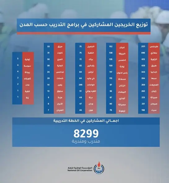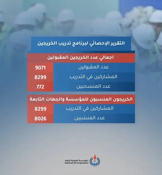 وأكدت المؤسسة الوطنية للنفط أن نشر هذه البيانات يأتي ضمن نهجها الرامي إلى إطلاع الرأي العام على نتائج برامجها التدريبية والتنموية، ودعم جهود تطوير وتأهيل الكوادر الوطنية الشابة بما يسهم في تعزيز قطاع النفط والغاز.