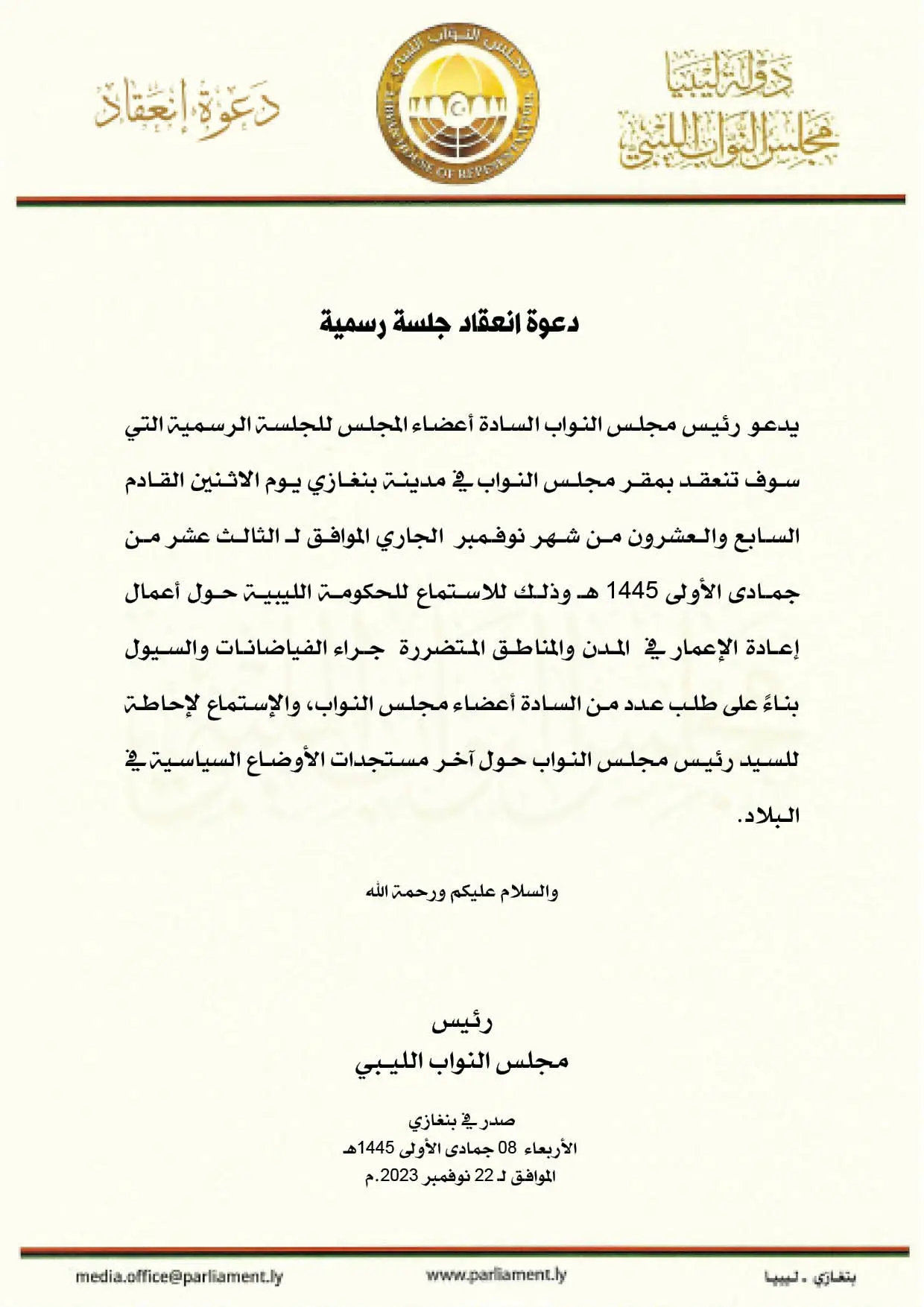 دعا رئيس مجلس النواب عقيلة صالح، اليوم الأربعاء، أعضاء المجلس للجلسة الرسمية التي سـوف تنعقد بمقر مجلس النواب في مدينة بنغازي يـوم الاثنين القادم الموافق 27 مـن شـهر نوفمبر الجاري.