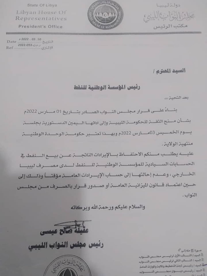 كشف الناشط السياسي فرج فركاش، أن رئيس مجلس النواب عقيلة صالح، وجه رسالة إلى رئيس المؤسسة الوطنية للنفط مصطفى صنع الله، طالبه فيها بعدم تحويل إيرادات النفط إلى حساب الإيرادات العامة والاحتفاظ بها في حساب مصرف ليبيا الخارجي.