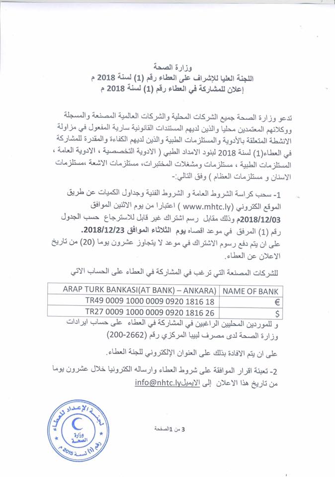 دعت وزارة الصحة بحكومة الوفاق الوطني جميع الشركات المحلية والشركات العالمية المصنعة المتعلقة بالأدوية والمستلزمات الطبية للمشاركة في العطاء رقم 1 لسنة 2018 لبنود الإمداد الطبي.