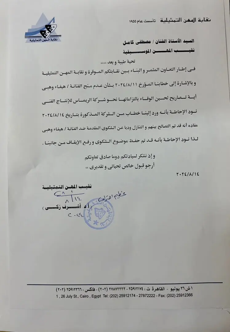 أعلنت نقابة المهن التمثيلية في مصر، “رفع إيقاف “هيفاء وهبي” بعد انتهاء أزمتها مع شركة “ريماس”.