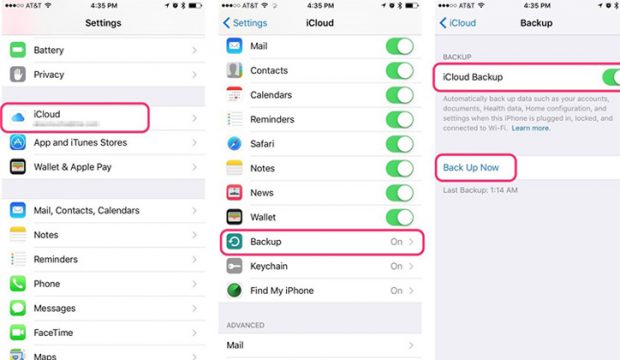 - من على الجهاز قم بفتح الإعدادات Settings ثم إتبع هذا المسار iCloud > Backup > iCloud Backup.