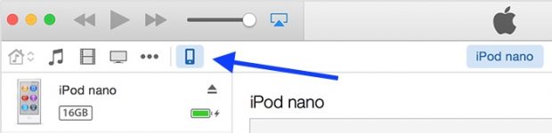 - في الـiTunes ستجد أيقونة جهاز الأي أو إس iOS قد ظهرت في الشريط بالأعلى كما موضح بالصورة، قم بالضغط عليها.