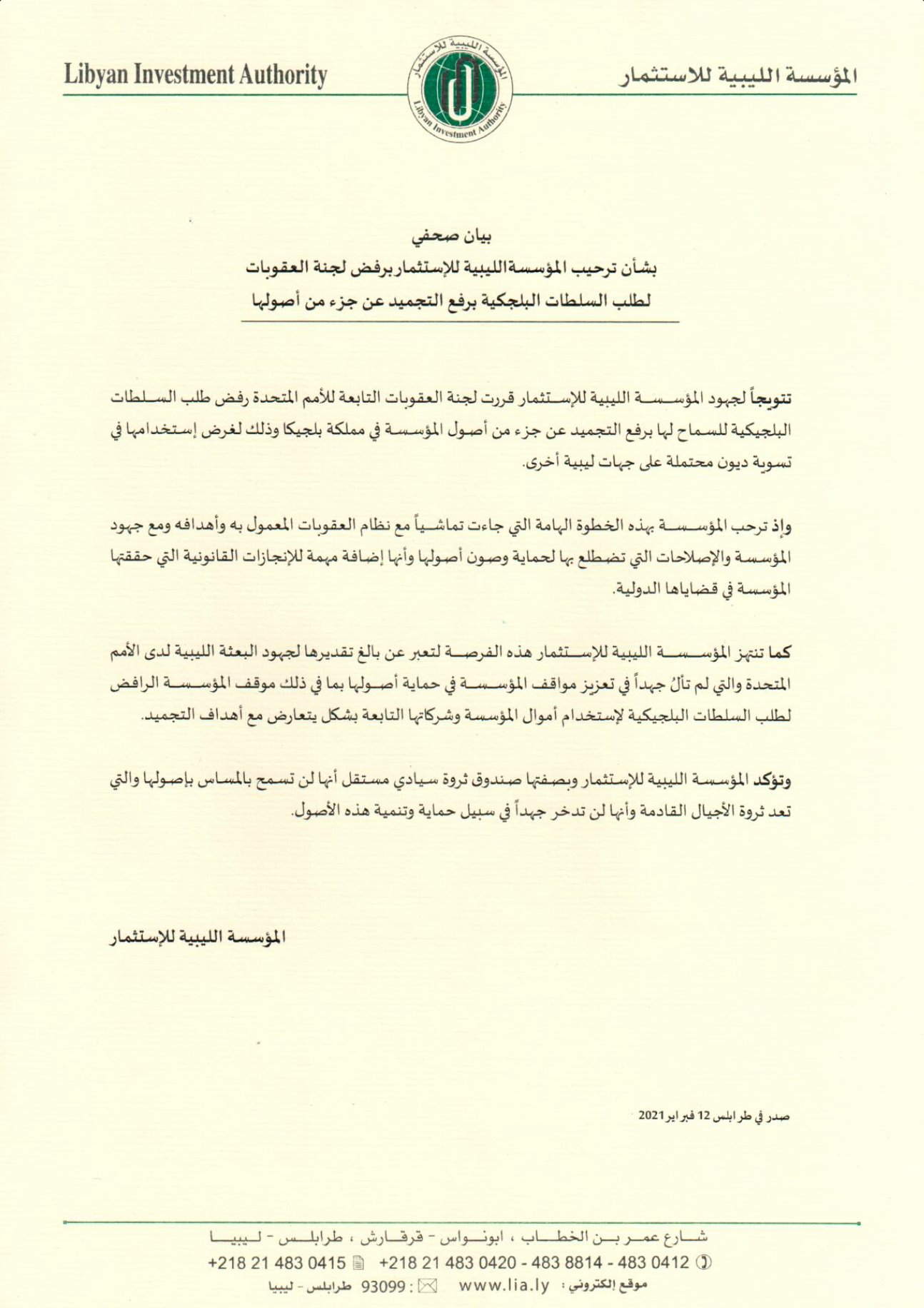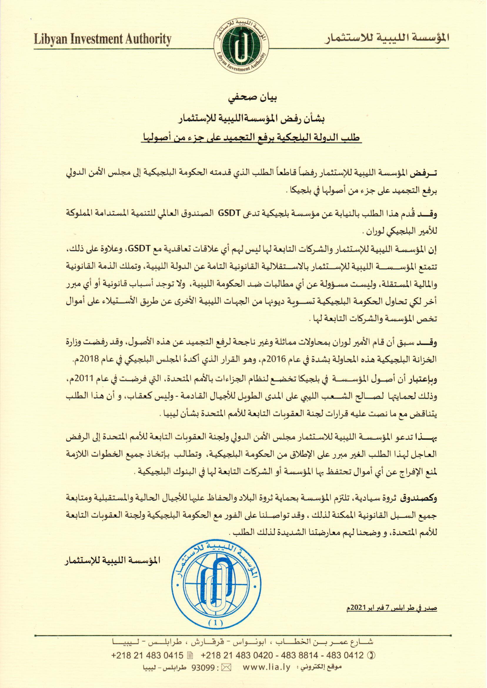 وفي سياقٍ ذي صلة، أعلنت المؤسسة الليبية للاستثمار عن رفضها القاطع، للطلب الذي قدمته الحكومة البلجيكية إلى مجلس الأمن الدولي برفع التجميد على جزء من أصولها في بلجيكا.
