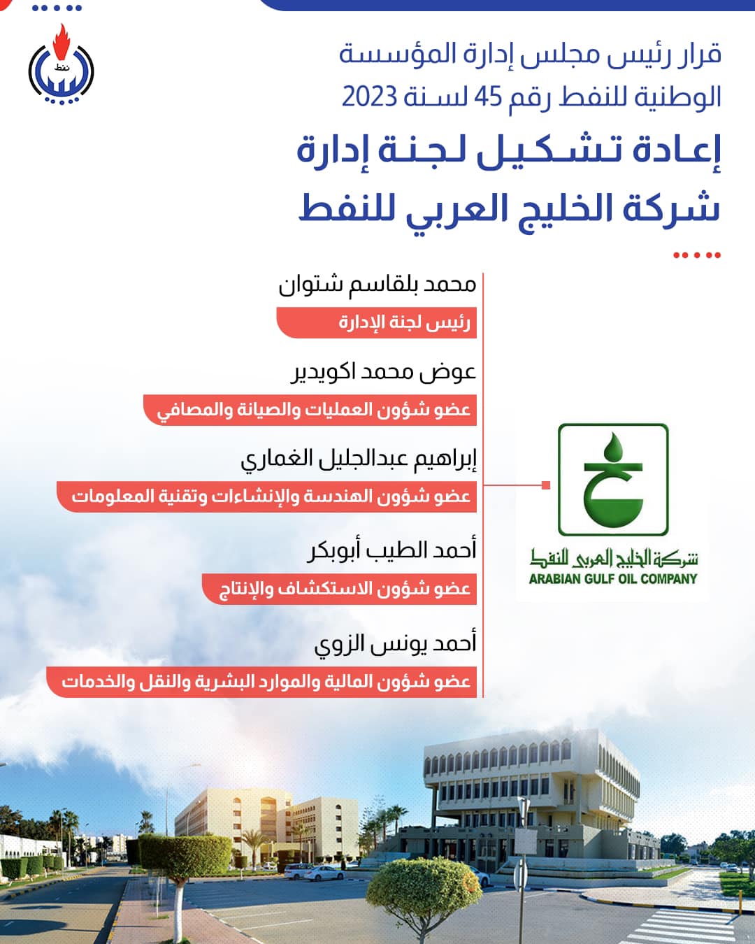 أصدر مجلس إدارة المؤسسة الوطنية للنفط، القرار رقم (45) لسنة 2023م بشأن إعادة تشكيل لجنة الإدارة بشركة الخليج العربي للنفط.