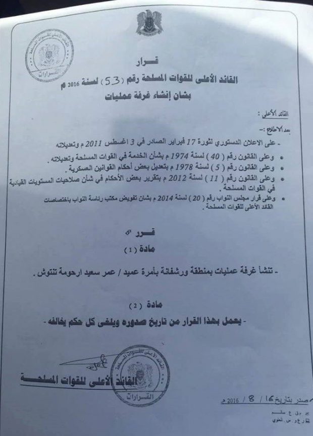 قرار “مجلس النواب” رقم 53 لعام 2016، جاء بناء على الإعلان الدستوري وتعديلاته وقرار مجلس النواب الصادر عام 2014 الذي فوض مكتب رئاسة المجلس بإختصاصات القائد الأعلى للقوات المسلحة.