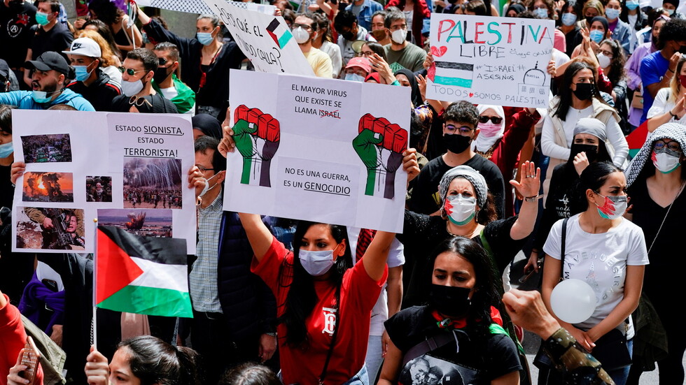 ولوح المتظاهرون بالأعلام الفلسطينية وهم يسيرون باتجاه ساحة بويرتا ديل سول بوسط مدريد، وهتفوا باللغة الإسبانية “هذه ليست حربا، هذه إبادة جماعية”، ورفع البعض لافتات كتب عليها “الولايات المتحدة دولة إرهابية” و”حياة المسلمين مهمة”، بحسب ما نقلت وكالة “أسوشيتد برس”.