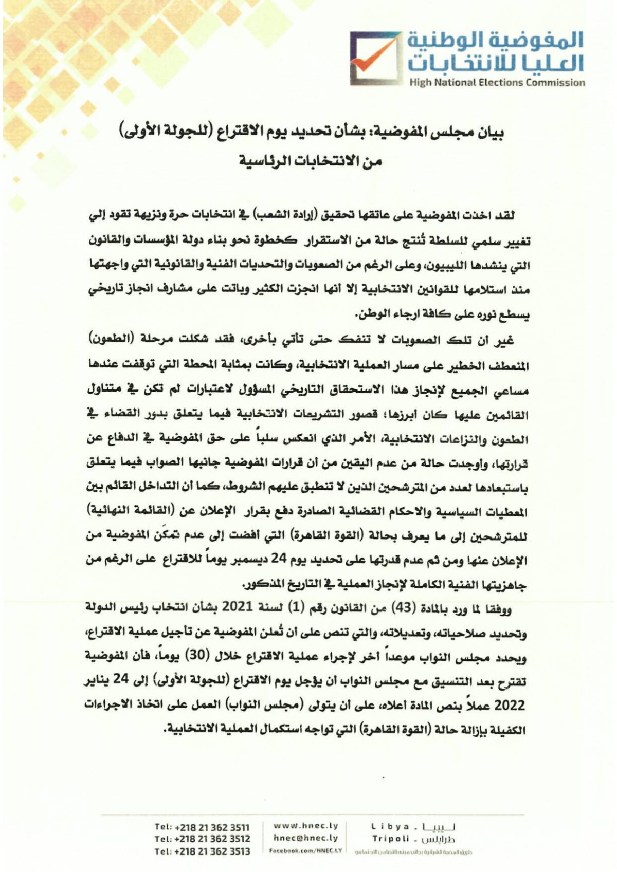 أعلنت المفوضية الوطنية العليا للانتخابات، تأجيل عملية الاقتراع، واقترحت بعد التنسيق مع مجلس النواب أن يؤجل يوم الاقتراع (للجولة الأولى) إلى 24 يناير 2022.
