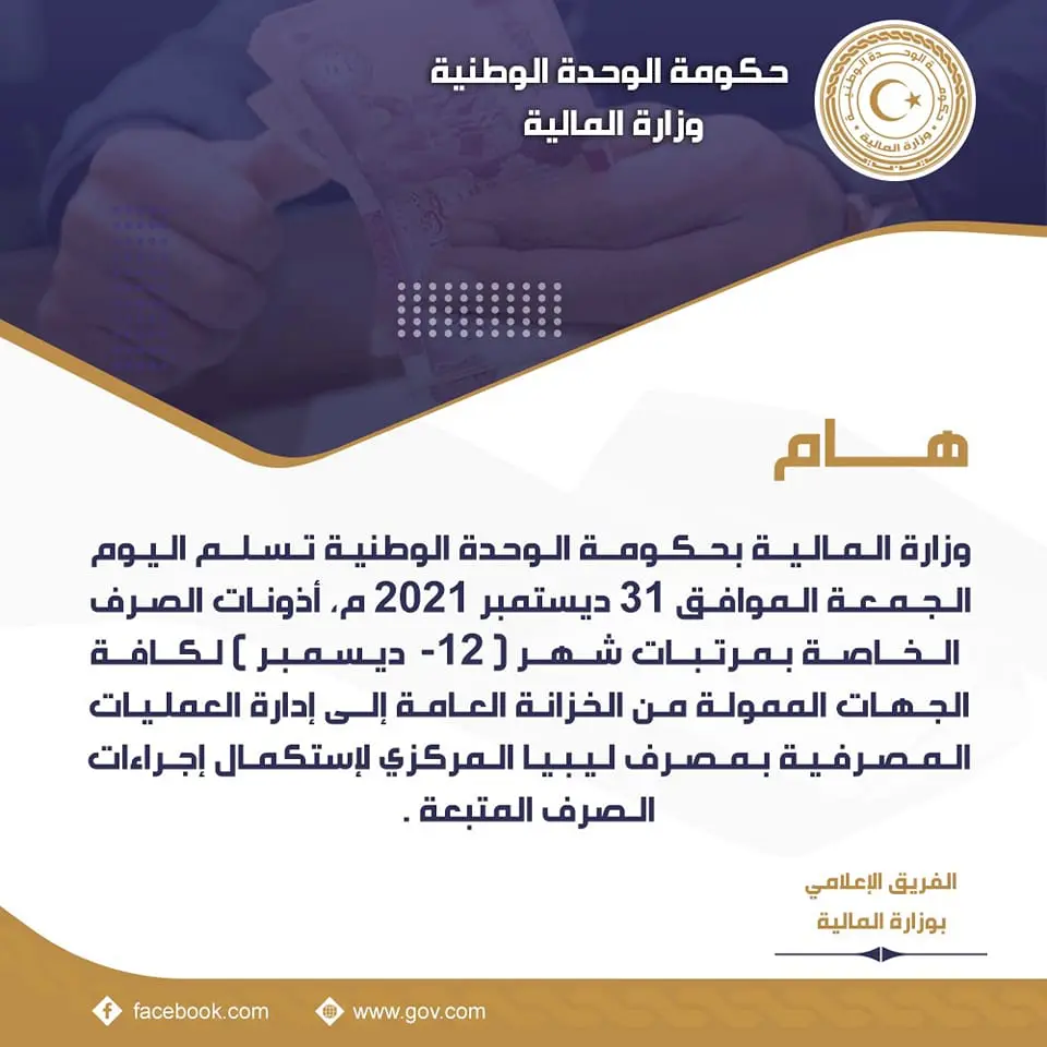 وتم تسليم أذونات الصرف الخاصة بمرتبات شهر ديسمبر 2021، إلى مصرف ليبيا المركزي لاستكمال إجراءات تسييلها إلى حسابات الجهات العامة.