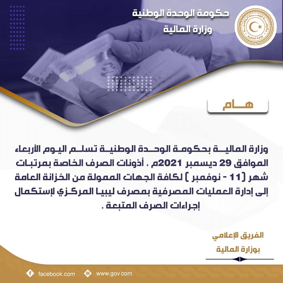 وتم تسليم أذونات الصرف الخاصة بمرتبات شهر نوفمبر الماضي، إلى مصرف ليبيا المركزي لاستكمال إجراءات تسييلها إلى حسابات الجهات العامة.