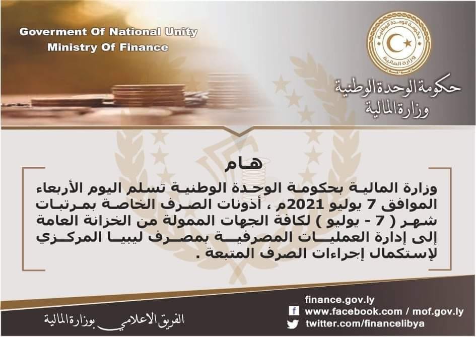 أعلنت وزارة المالية بحكومة الوحدة الوطنية، عن إحالة مرتبات يوليو الجاري، إلى مصرف ليبيا المركزي.