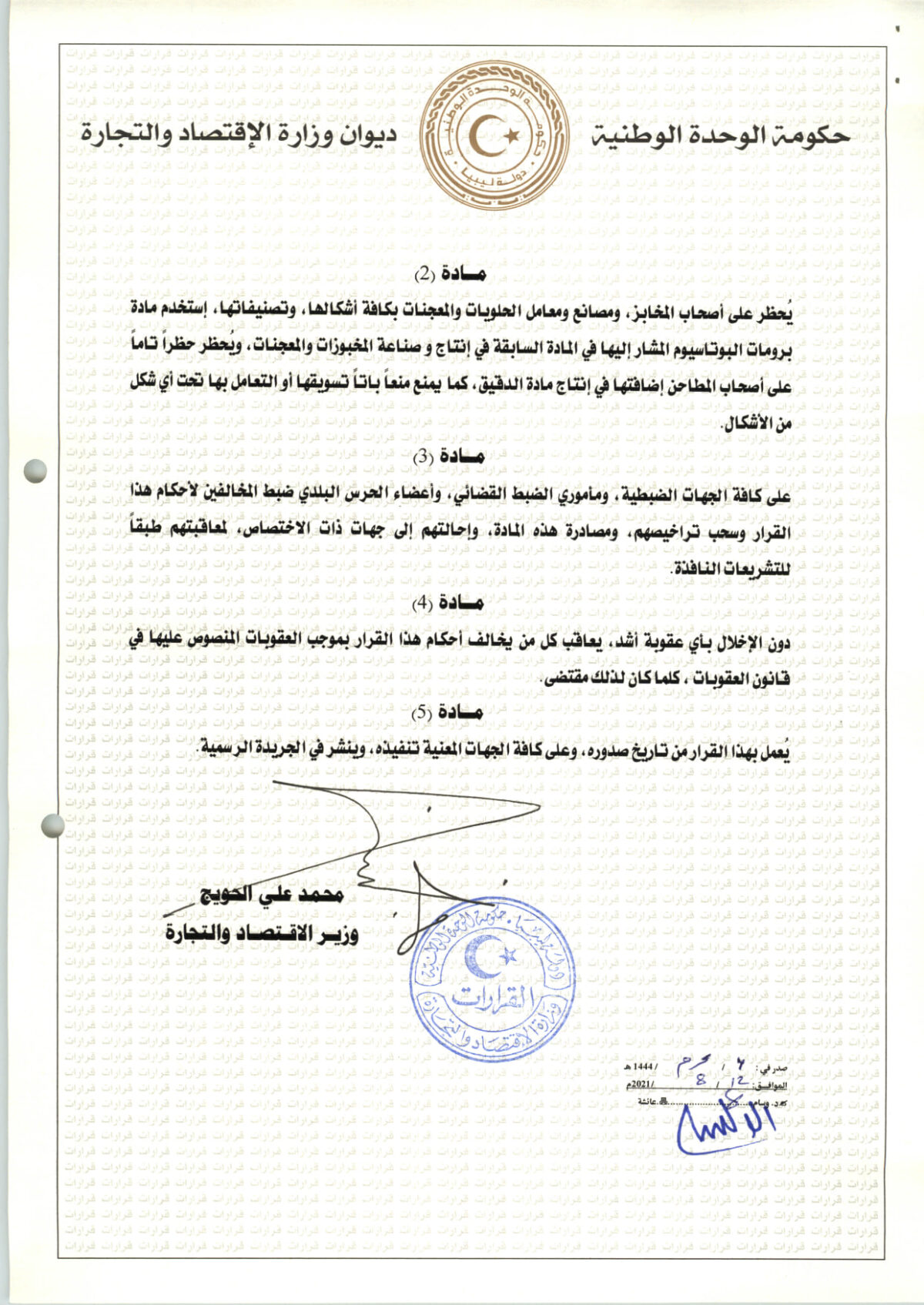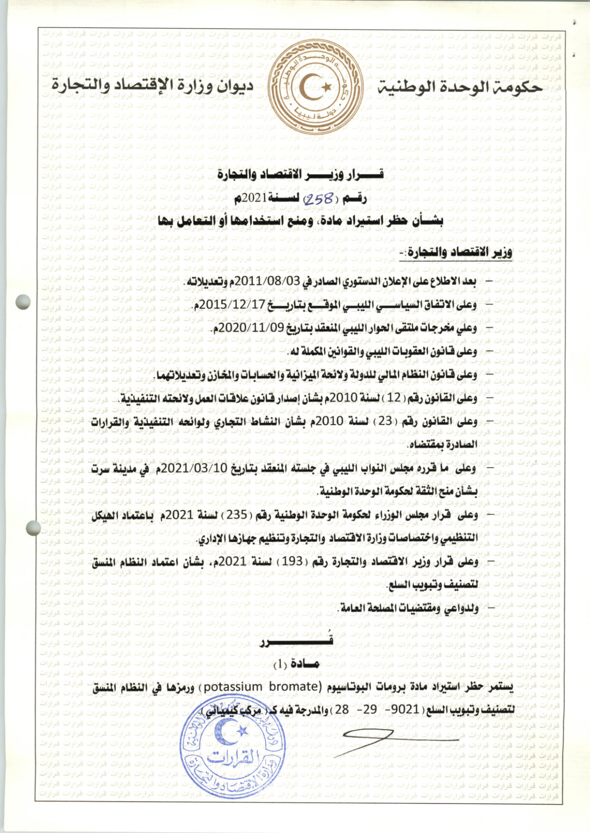 أصدر وزير الاقتصاد والتجارة بحكومة الوحدة الوطنية محمد الحويج، القرار رقم 258 لسنة 2021 م بشأن حظر استيراد مادة ومنع استخدامها او التعامل بها.