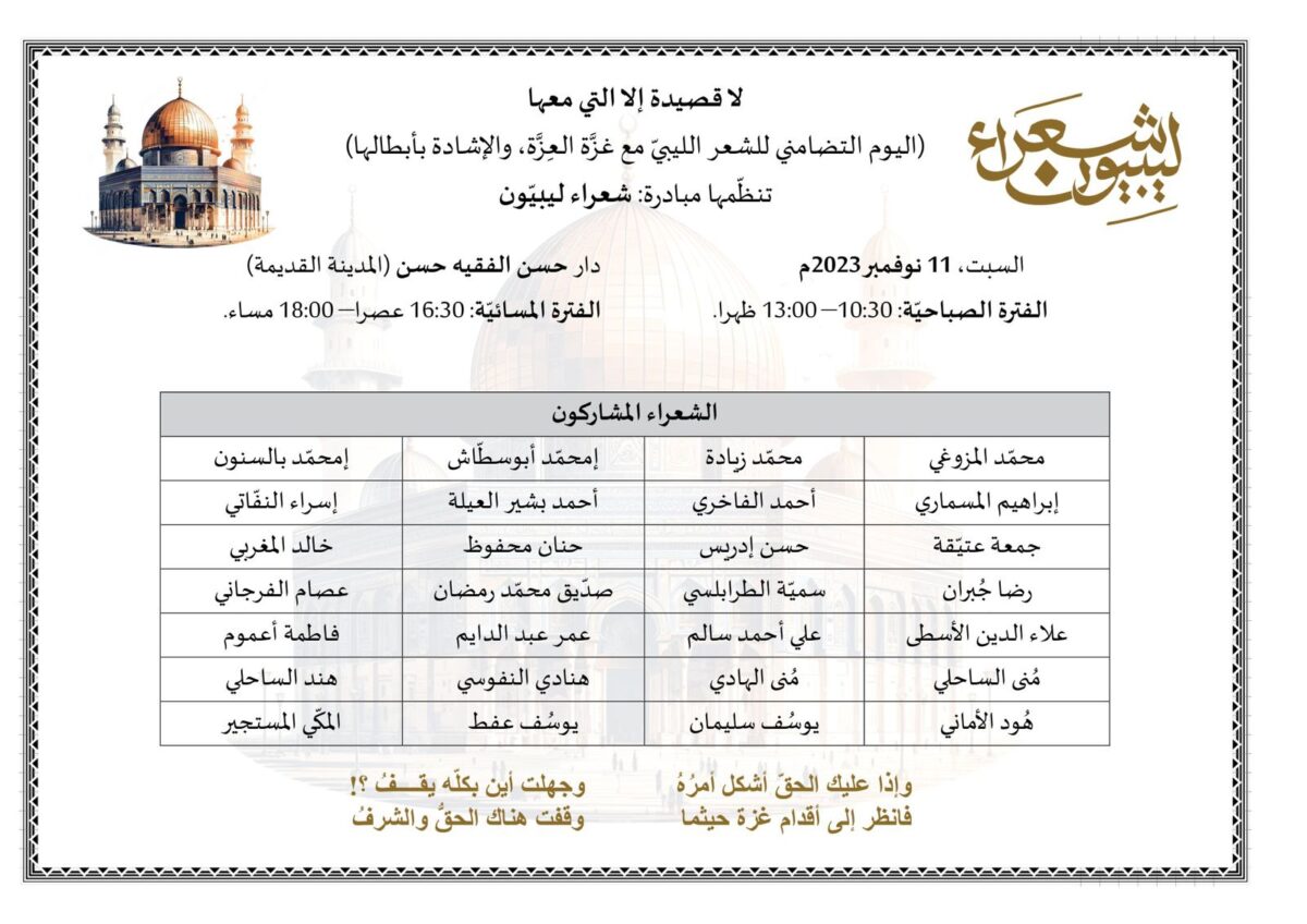 وسيشارك في اليوم التضامني عدد من الشعراء، وذلك في إطار الدعم الشعبي الليبي المتواصل للشعب الفلسطيني وتنديداً بالعداون الإسرائيلي على قطاع غزة.