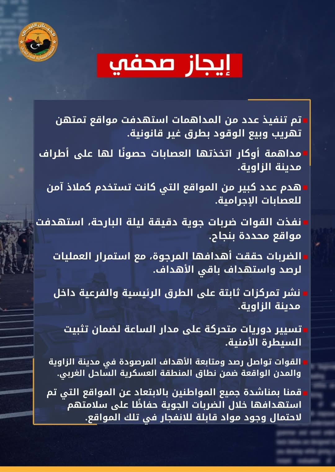 نشرت المنطقة العسكرية “الساحل الغربي”، بيانا حول آخر مستجدات العمليات العسكرية في مدينة الزاوية.