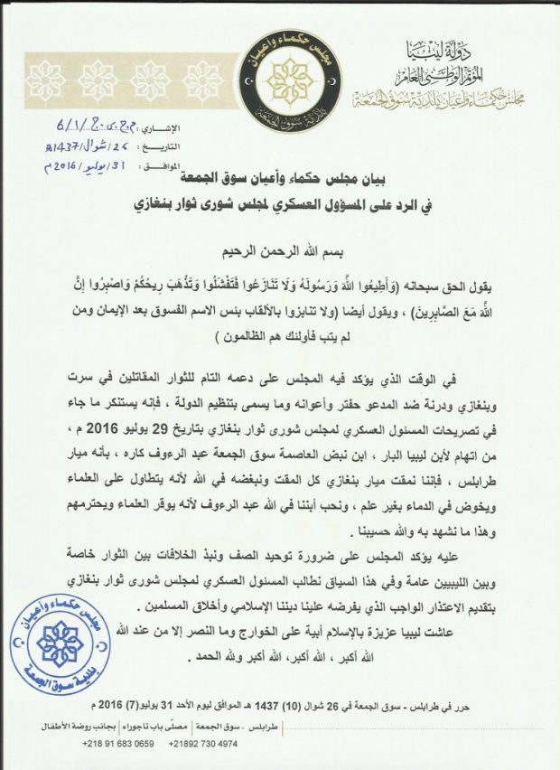 وجدد المجلس دعمه التام “للثوار” المقاتلين بسرت وبنغازي ودرنة ضد “قوات الكرامة”، و”تنظيم الدولة” مشدداً على أهمية توحيد الصفوف ونبذ الخلافات بين الثوار مطالباً وسام بن حميد بالإعتذار.