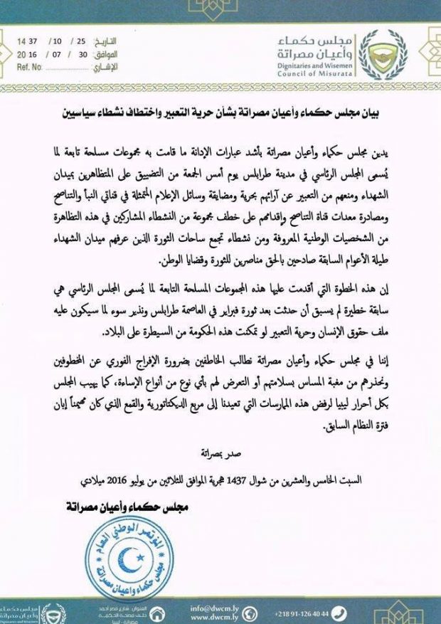 وطالب مجلس حكماء وأعيان مصراتة الخاطفين بالإفراج الفوري عن المخطوفين والمجلس محذرا من المساس بسلامتهم أو التعرض لهم. وأهاب المجلس بكل أحرار ليبيا رفض هده الممارسات التي تعيدنا إلى مربع الدكتاتورية والقمع. حسب نص البيان.