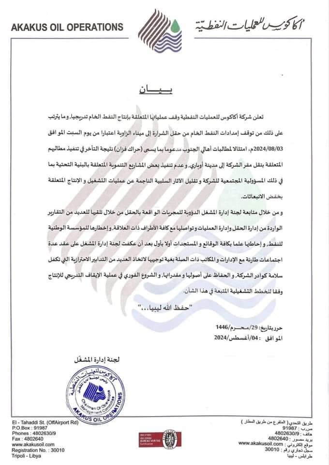 أعلنت شركة أكاكوس للعمليات النفطية، اليوم الأحد، وقف عملياتها المتعلقة بإنتاج النفط الخام تدريجيا، وما يترتب عن ذل من توقف إمدادات النفط الخام من حقل الشرارة إلى ميناء الزاوية اعتبارا من يوم أمس السبت.