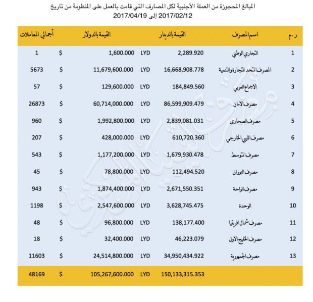 وفيما يلي جدول بالمصارف وعدد المعاملات والقيمة بالدولار وبالدينار في كل مصرف حتى يوم 19 أبريل الحالي ، والتي بلغ إجمالي ماتمَّ بيعه حتى الآن أكثر من 100 مليون دولار: