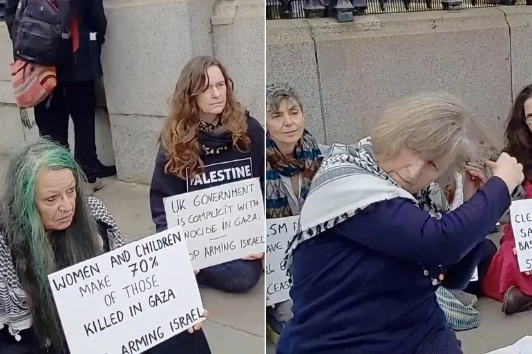 وأظهر المقطع المنشور، المتظاهرات وهن يجلسن أمام مقر مجلس العموم البريطاني ويستخدمن ماكينة حلاقة كهربائية لإزالة شعرهم أمام المارة، وهتفت المتظاهرات، اللاتي ارتدى بعضهم الكوفية الفلسطينية “فلسطين حرة حرة”.