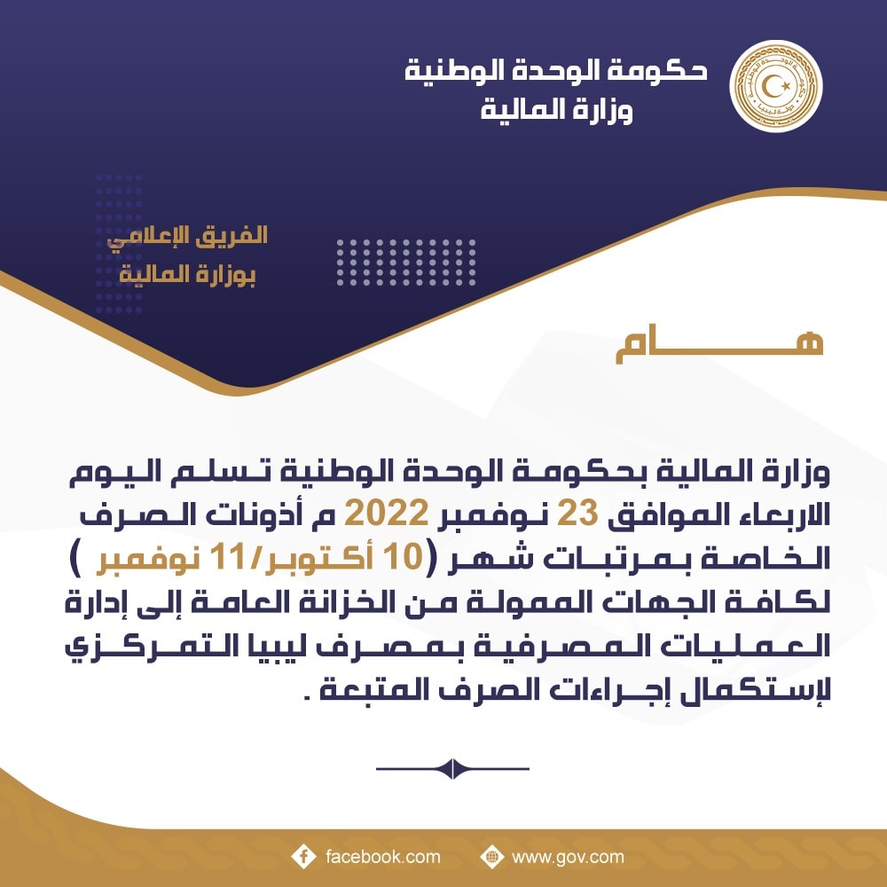 أعلنت وزارة المالية بحكومة الوحدة الوطنية، عن إحالة مرتبات شهر أكتوبر الماضي ونوفمبر الجاري، إلى مصرف ليبيا المركزي.