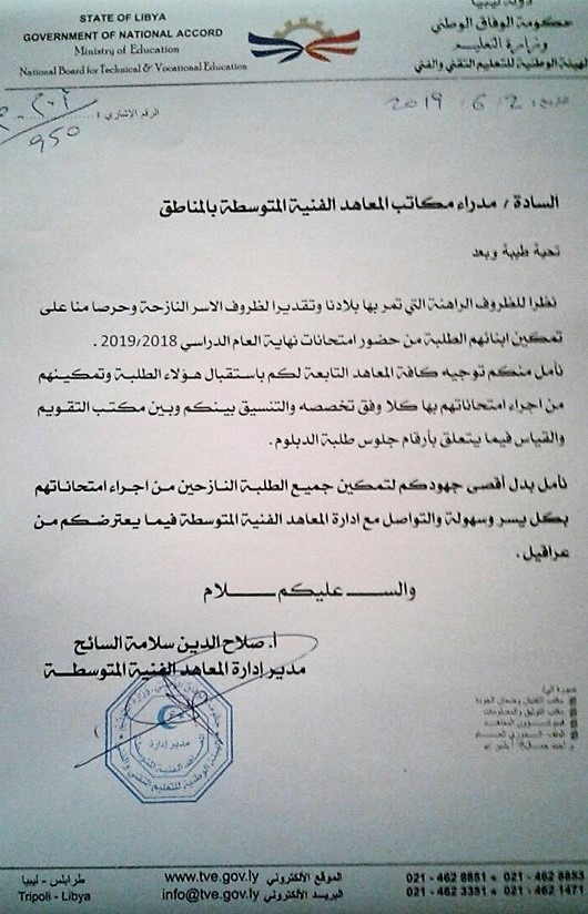 حيث جاء الخطاب حرصاً من الهيئة الوطنية للتعليم التقني والفني على سلامة أبنائها الطلبة بالمعاهد الفنية المتوسطة الواقعة في مناطق الاشتباكات، وتقديراً لظروف الأسر النازحة.