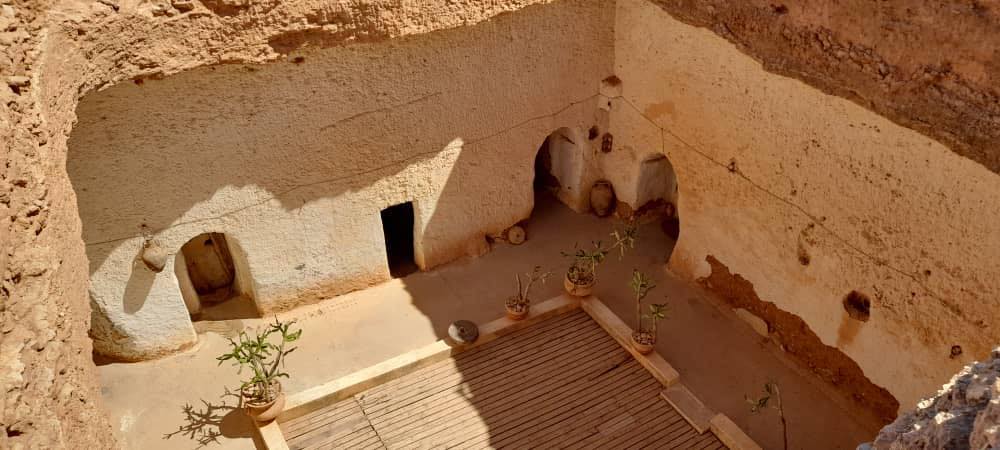 وتسمى المساحة التي تفتح فيها الديار بوسط الحوش، ويمكن الخروج من المنزل الموصوف عن طريق ما يسمى (السقيفة) وهو خندق بارتفاع 4 أمتار تقريباً يتم حفره بطريق مائلة وبزاوية 45 تقريباً حتى يصل إلى سطح الأرض، ويكون للمسكن باب رئيسي مصنوع من خشب الزيتون، وله قفل حديد ومفتاح طويل مميز، وأحياناً يصنع القفل والمفتاح من الخشب.