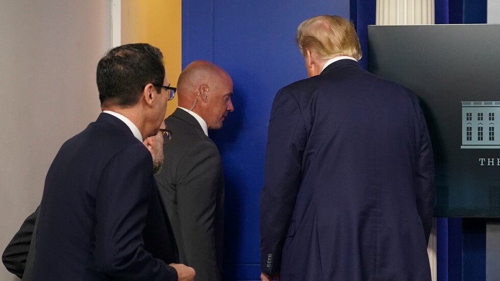 وقامت الخدمة السرية بالبيت الأبيض، بإخراج الرئيس دونالد ترامب من قاعة المؤتمر صحفي.